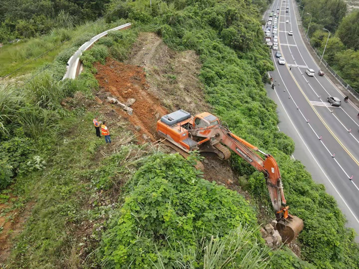 8月31日,路橋公司在當(dāng)?shù)亟痪块T的交通管控配合下,采用大型長臂挖掘機(jī),對上邊坡松動(dòng)破碎巖體進(jìn)行臨時(shí)排危處置,并對下沉點(diǎn)位裂縫實(shí)施黃泥密閉夯實(shí),及時(shí)降低了山體落石及雨水持續(xù)滲透下沉的風(fēng)險(xiǎn),經(jīng)過兩個(gè)小時(shí)的緊急排危除險(xiǎn),松動(dòng)破碎巖體得到有效處置,路面堆積的泥土全部清理干凈,道路恢復(fù)通行。