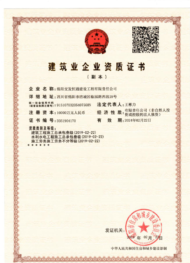 至此,恒通建工已擁有公路工程、市政公用工程施工總承包二級,公路路基工程、路面工程、橋梁工程專業(yè)承包二級,建筑工程、水利水電施工總承包三級和施工勞務(wù)施工勞務(wù)不分等級等資質(zhì)。并正在積極申報公路工程施工總承包一級,隧道工程、城市及道路照明工程、公路交通工程專業(yè)承包二級(公路安全設(shè)施分項)。