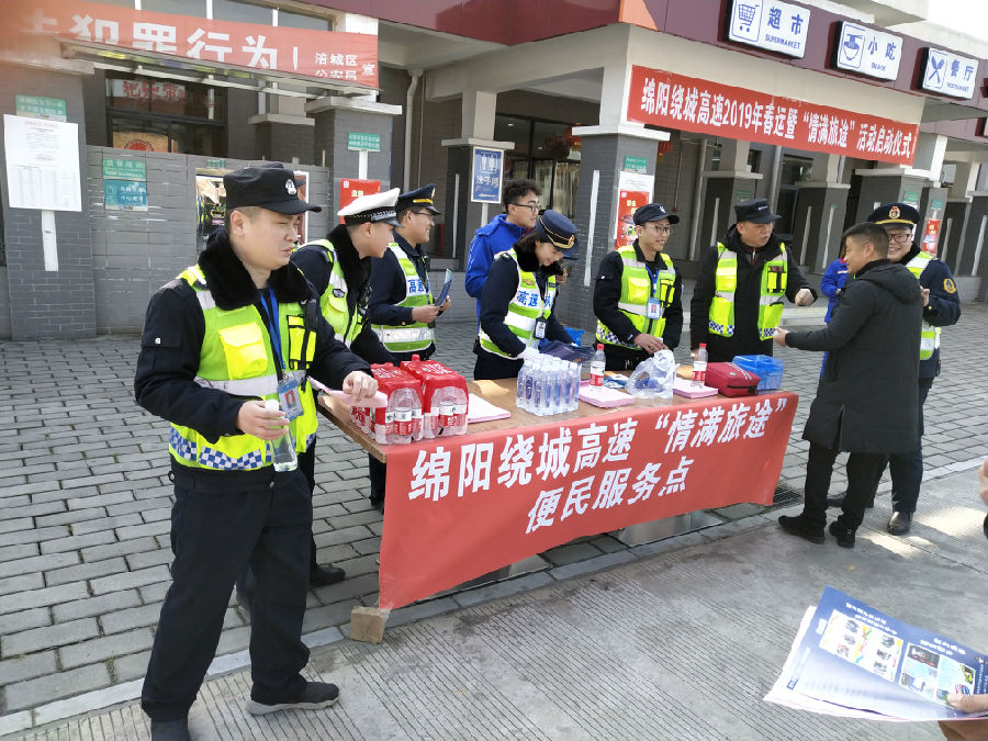 1 月 21 日,綿陽繞城高速管理所聯(lián)合高速交通執(zhí)法、高速交警 在綿陽南服務(wù)區(qū)舉行了綿陽繞城高速 2019 年春運暨“情滿旅途” 活動啟動儀式。儀式現(xiàn)場設(shè)立了“春運安全 情滿旅途”宣傳點 和便民服務(wù)點,積極開展了咨詢引導(dǎo)、秩序維護、便民利民、應(yīng) 急救護等便民服務(wù)工作,主動為過往司乘人員特別是農(nóng)民工提供 開水藥品、交通咨詢、車輛維修、應(yīng)急救援等暖心服務(wù),充分讓農(nóng)民工兄弟感受到回鄉(xiāng)返崗旅途的溫暖,增進了人民群眾對綿陽 繞城高速春運服務(wù)的獲得感和認(rèn)同感。為確保綿陽繞城高速春運 期間安全營運奠定了堅實的基礎(chǔ)。