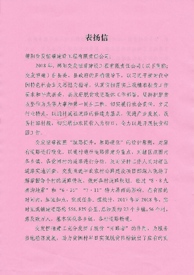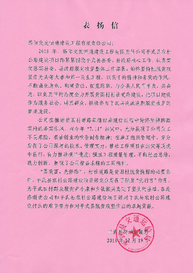 近日,恒通建工分別收到了來自平武縣人民政府和平武縣交通運輸局的兩封表揚信。信中對恒通建工在平武農(nóng)村公路項目實施過程中,以通村通社道路的修建為基點,促進產(chǎn)業(yè)發(fā)展,切實履行社會責任,充分發(fā)揮脫貧“開路者”和“先行官”的精神進行了表揚。特別是在今年“7.11”洪災中,恒通建工攻堅克難、吃苦耐勞,推動項目在逆境中前行;強抓工程質量管理,展現(xiàn)了精益求精的工匠精神;在有限的時間內,加班加點,已累計完成鋪建道路約556.829公里,總涉及約23個鄉(xiāng)鎮(zhèn),56個村,惠及數(shù)萬人,基本實現(xiàn)各鄉(xiāng)鎮(zhèn)、各村道路暢通,為平武農(nóng)村群眾脫貧奔小康和鄉(xiāng)鎮(zhèn)振興奠定了堅實的基礎。