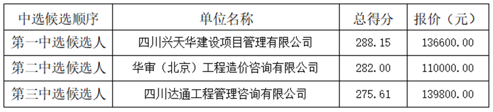 四川久安工程管理有限公司(以下簡稱“代理機構(gòu)”)組織比選的“增加城市科技元素(一期)項目結(jié)算審計服務”項目(項目編號:四川久安比選[2021]4號),于2021年09月14日10時30分(北京時間)由比選小組評審,招標人代表、現(xiàn)場監(jiān)督人員參加。本次評比小組依法評比結(jié)果及授標建議如下: ?