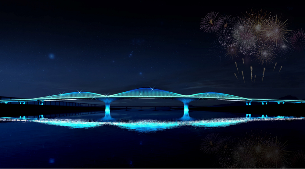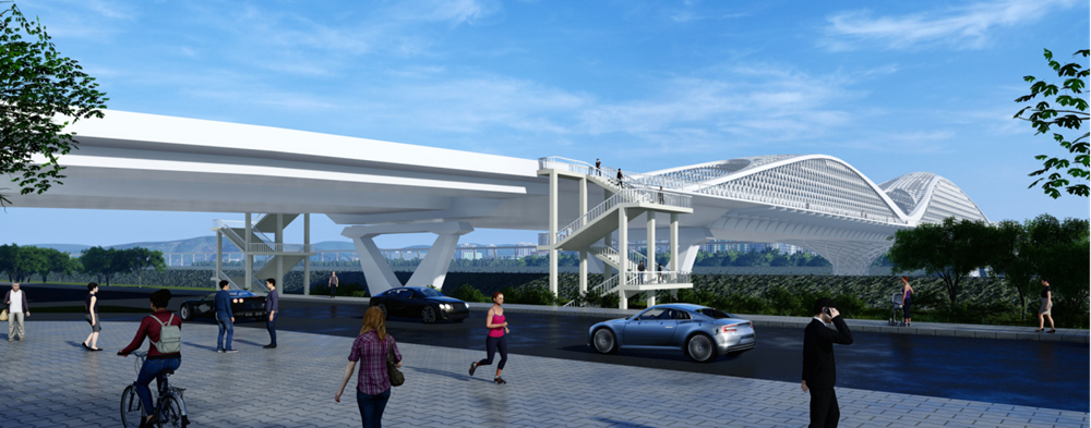 橋梁為主跨180m 連續(xù)梁橋,橋面設置層次豐富的空間網(wǎng)狀構架,造型設計新穎,猶如在時空之隧中穿梭,體現(xiàn)綿陽科技之城不斷探求未知世界、永攀科技高峰精神?! ?/p>