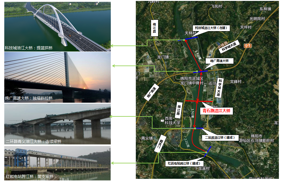 ? ? ? ?青石路涪江大橋是科技城新區(qū)北翼橫跨涪江,聯(lián)系涪城青義片區(qū)、游仙石馬片區(qū)的重要橋梁。項目起于青義鎮(zhèn)綿江路與青石路交叉口,止于石馬鎮(zhèn)科學城大道與青石路交叉口,全長約1.3km,含橋梁及道路兩側綠化景觀工程。