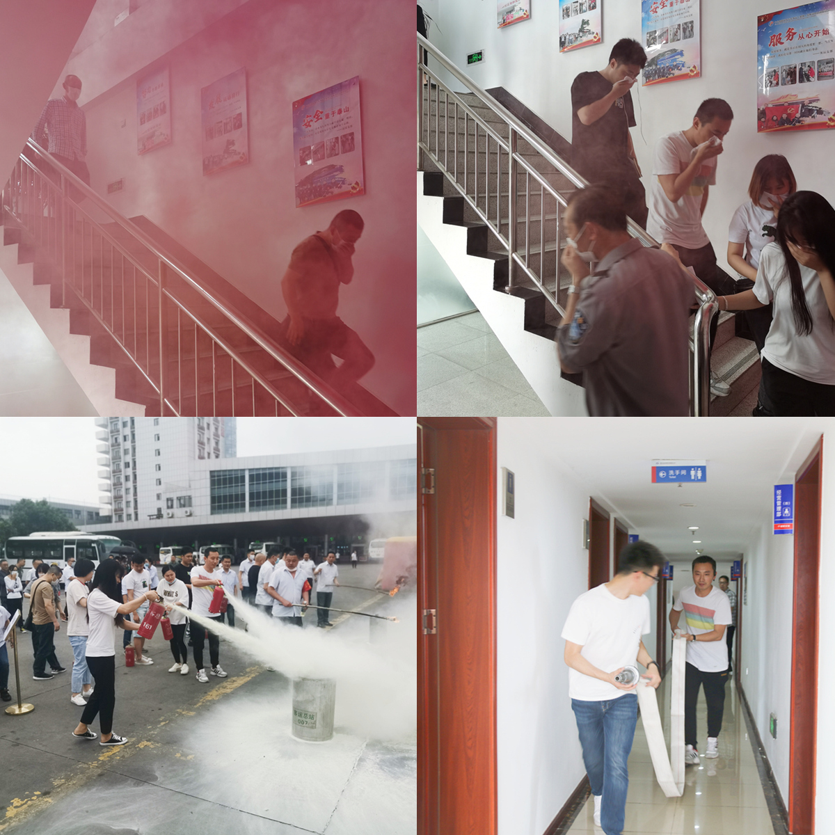 ? ? ? ?15時(shí)30分,演練正式開(kāi)始。在李松的現(xiàn)場(chǎng)指導(dǎo)下,參訓(xùn)職工聽(tīng)到警報(bào)后按照預(yù)案和分工,迅速疏散人員,用濕毛巾捂住口鼻,彎腰穿越模擬濃煙霧區(qū),從樓層兩側(cè)安全出口迅速有序撤離至安全區(qū)。