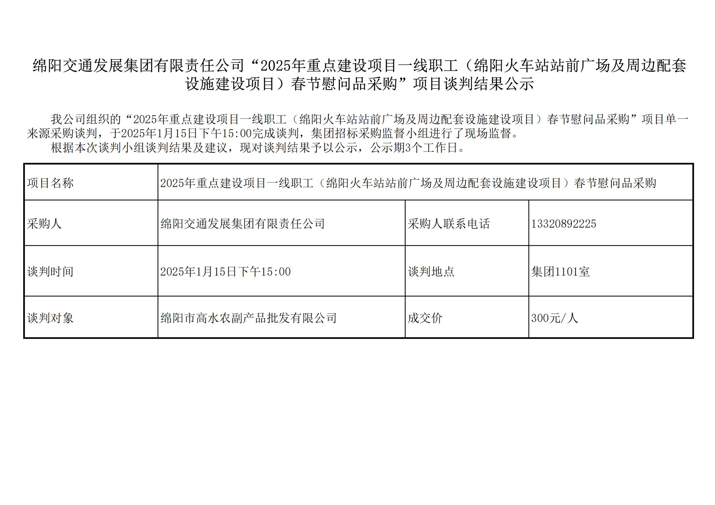 綿陽(yáng)交通發(fā)展集團(tuán)有限責(zé)任公司“2025年重點(diǎn)建設(shè)項(xiàng)目一線職工(綿陽(yáng)火車(chē)站站前廣場(chǎng)及周邊配套設(shè)施建設(shè)項(xiàng)目)春節(jié)慰問(wèn)品采購(gòu)”項(xiàng)目談判結(jié)果公示