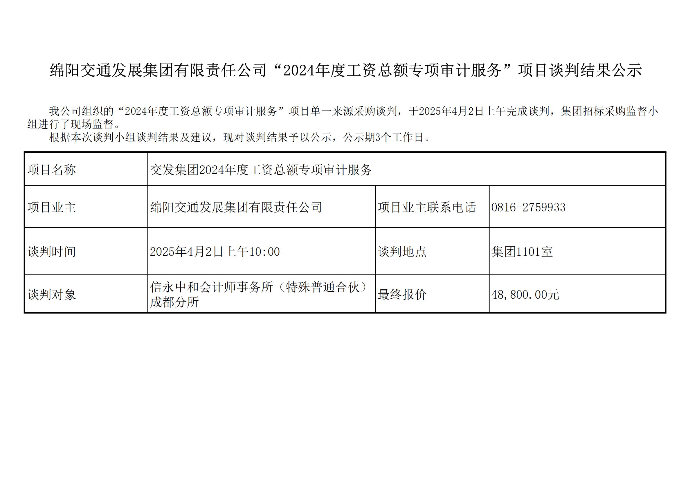 綿陽交通發(fā)展集團有限責任公司“2024年度工資總額專項審計服務”項目談判結果公示