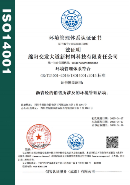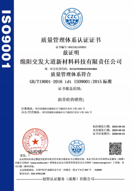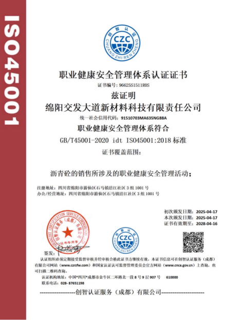 喜報(bào)!交發(fā)大道新材料公司榮獲質(zhì)量、環(huán)境及職業(yè)健康安全管理體系認(rèn)證證書