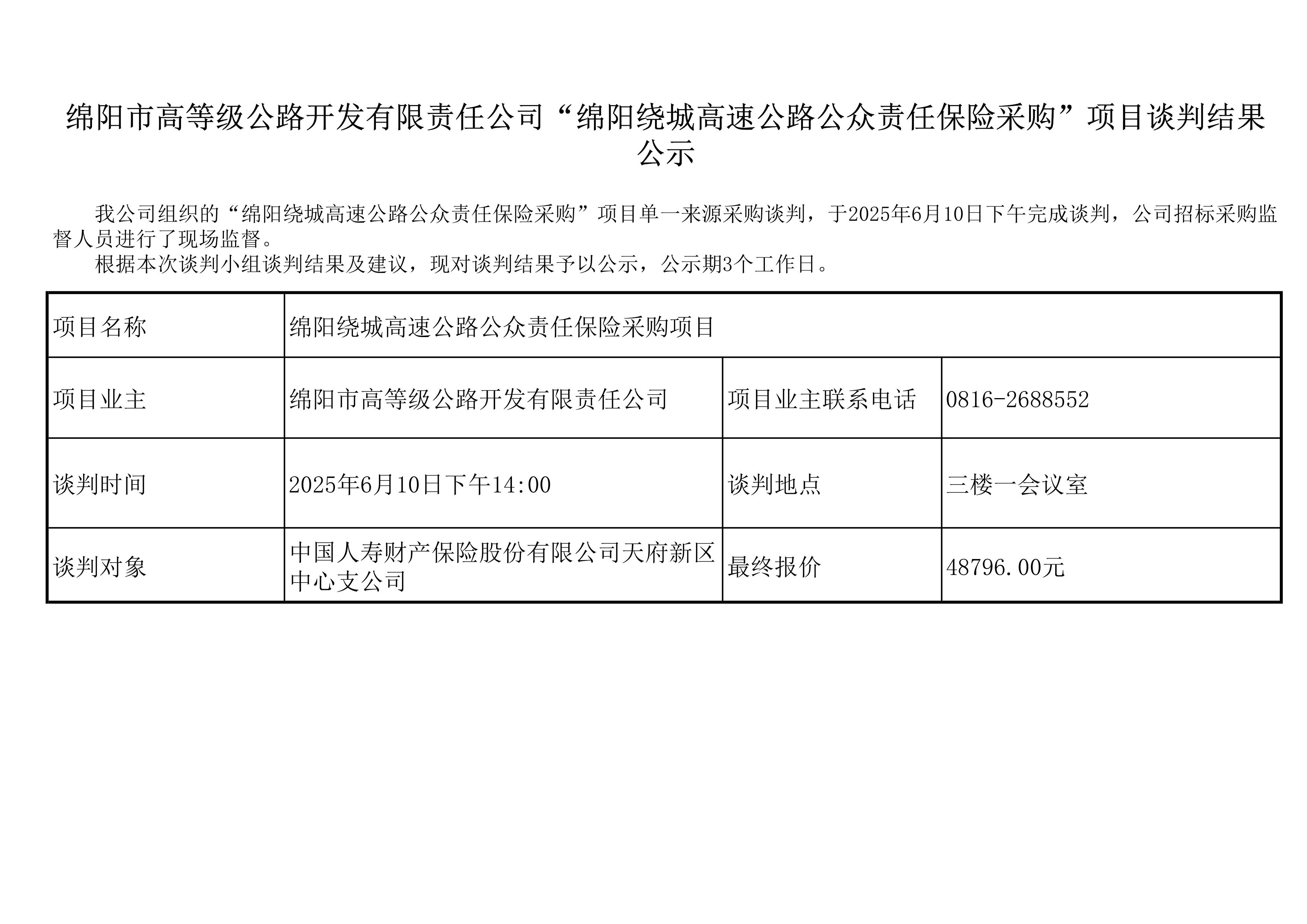 綿陽市高等級公路開發(fā)有限責任公司“綿陽繞城高速公路公眾責任保險采購”項目談判結(jié)果公示