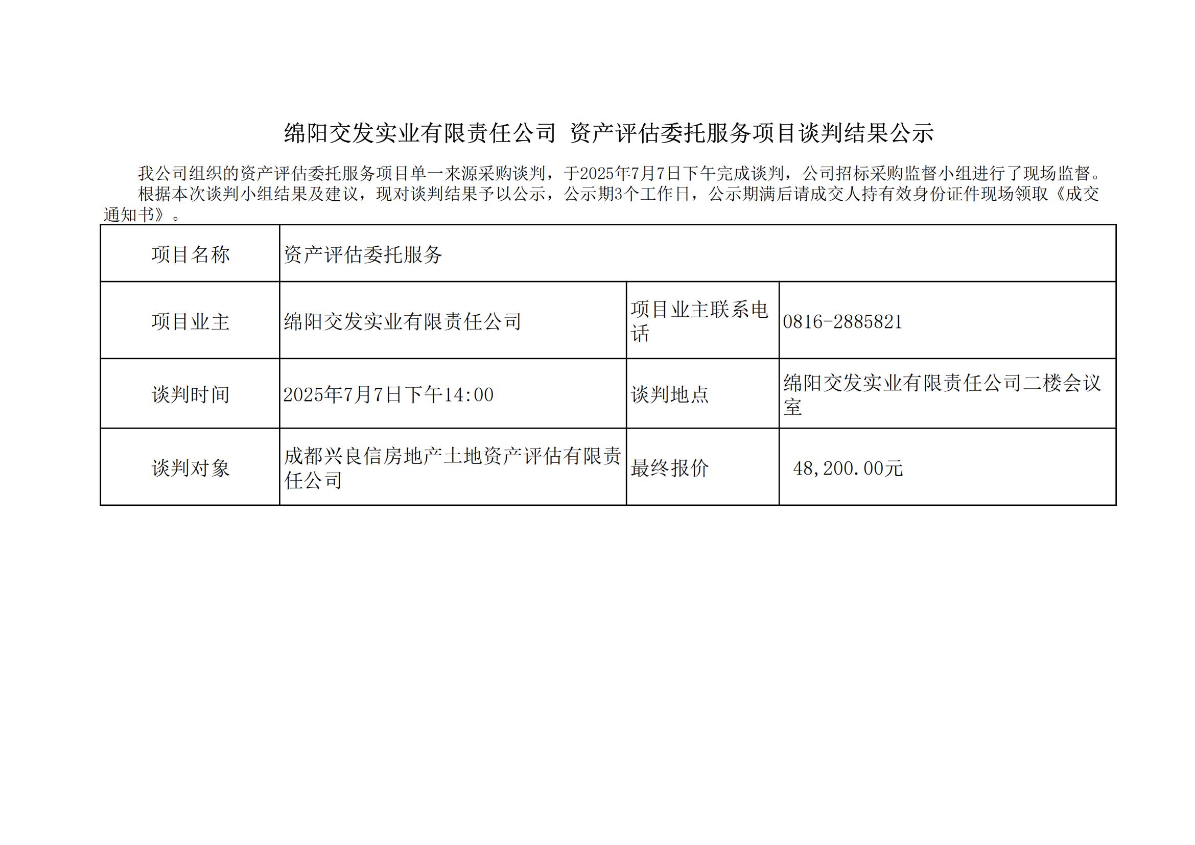 綿陽交發(fā)實業(yè)有限責任公司資產(chǎn)評估委托服務項目談判結(jié)果公示
