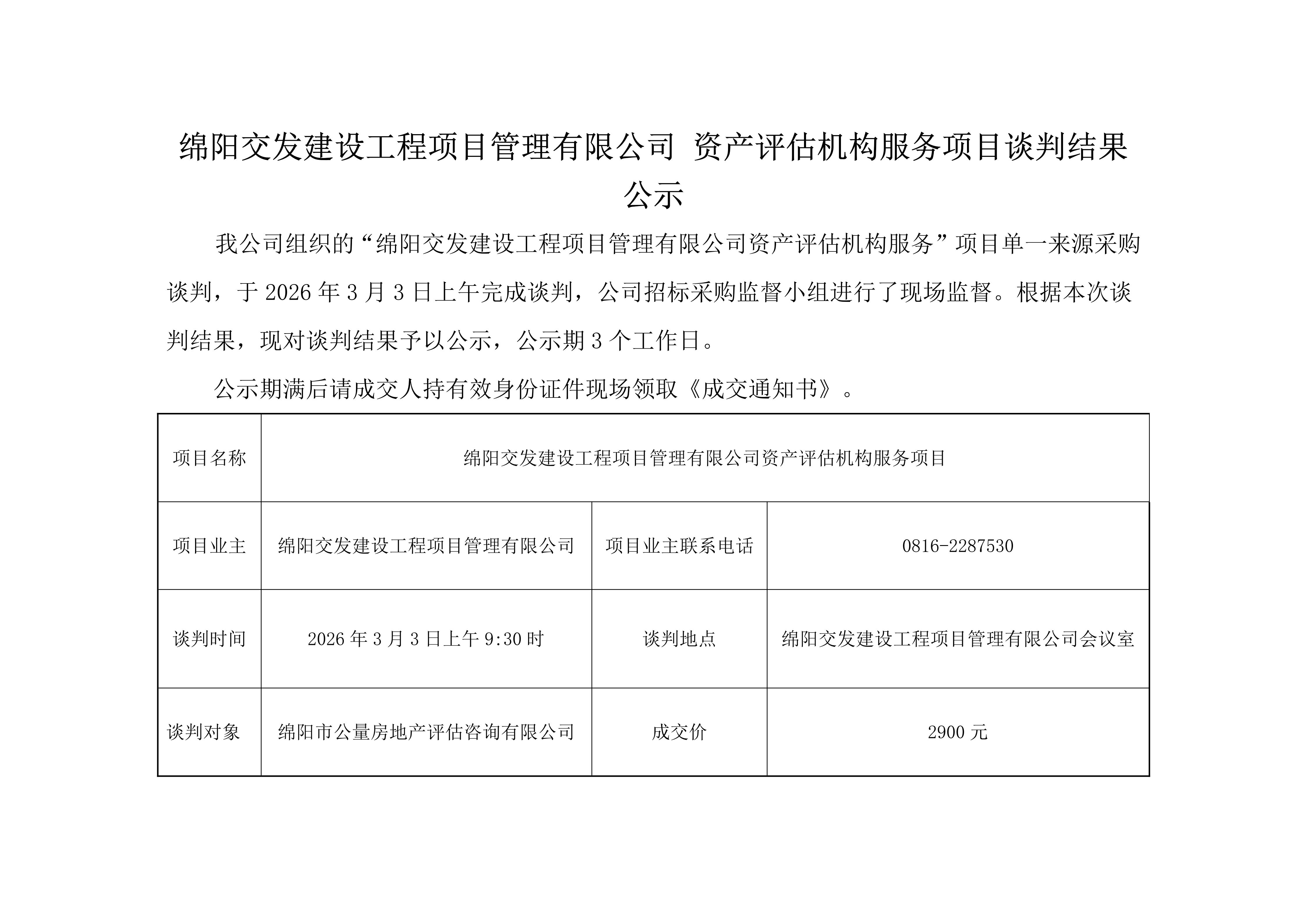 綿陽(yáng)交發(fā)建設(shè)工程項(xiàng)目管理有限公司 資產(chǎn)評(píng)估機(jī)構(gòu)服務(wù)項(xiàng)目談判結(jié)果公示