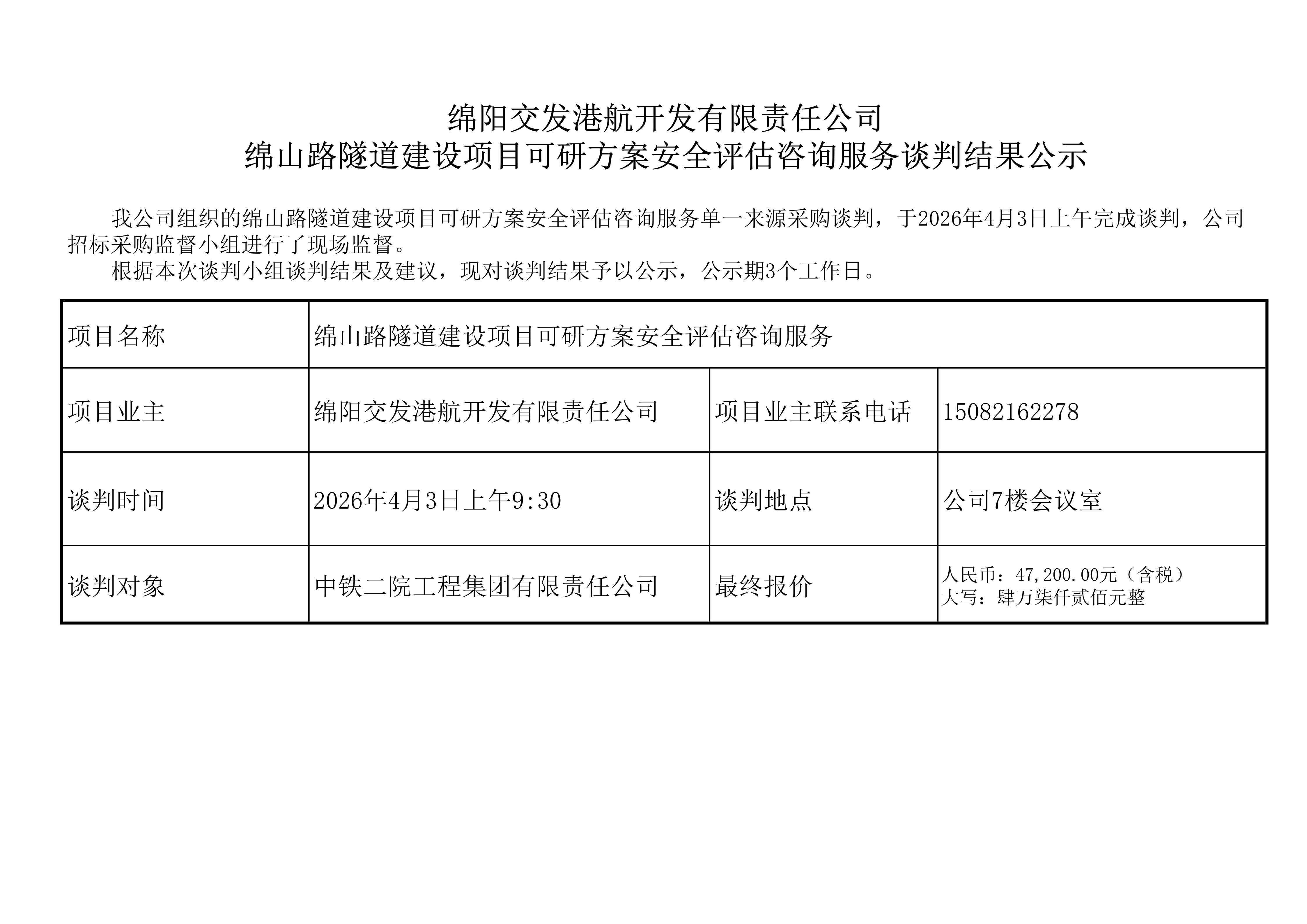 綿陽(yáng)交發(fā)港航開(kāi)發(fā)有限責(zé)任公司 綿山路隧道建設(shè)項(xiàng)目可研方案安全評(píng)估咨詢(xún)服務(wù)談判結(jié)果公示