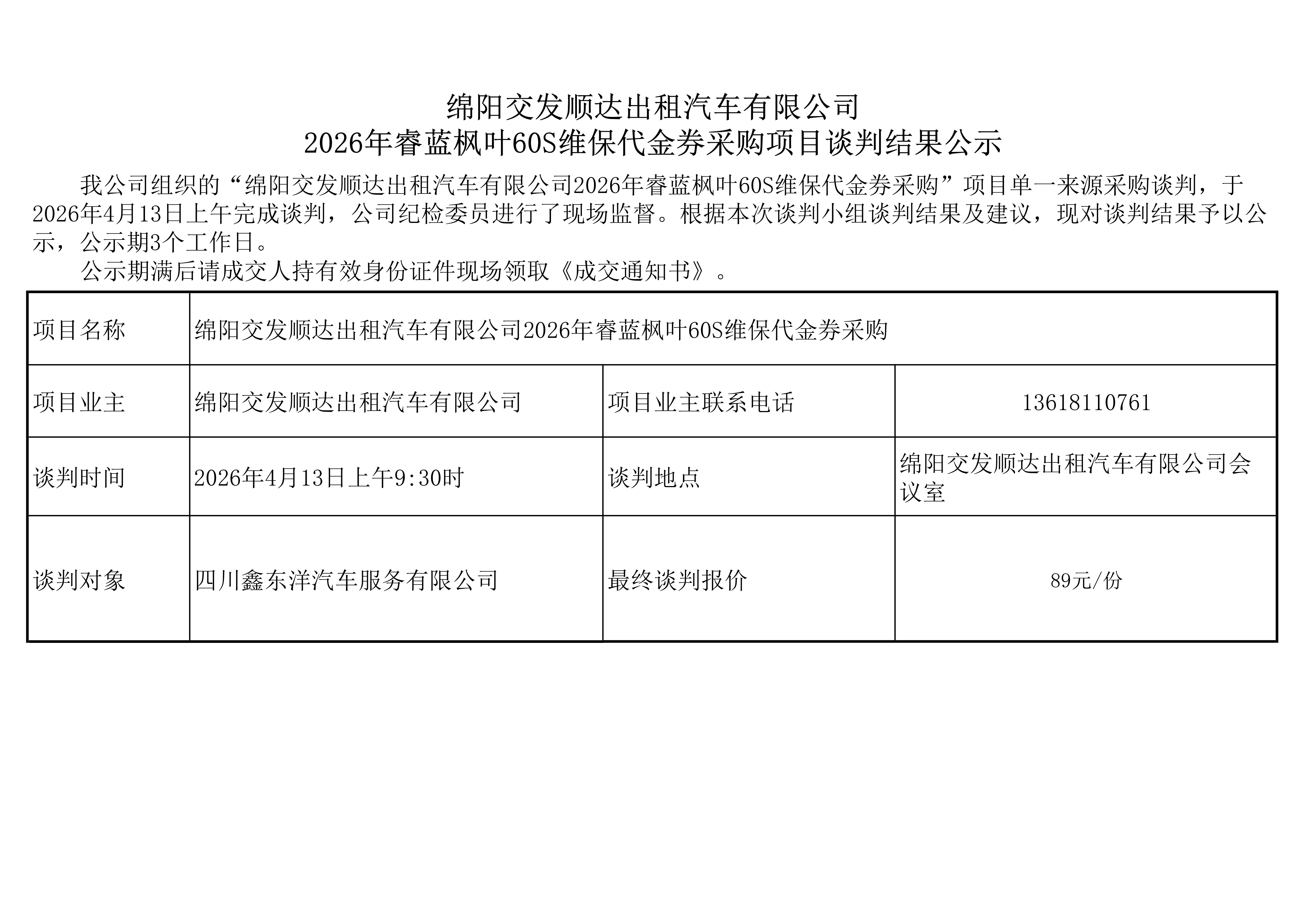 綿陽(yáng)交發(fā)順達(dá)出租汽車有限公司 2026年睿藍(lán)楓葉60S維保代金券采購(gòu)項(xiàng)目談判結(jié)果公示