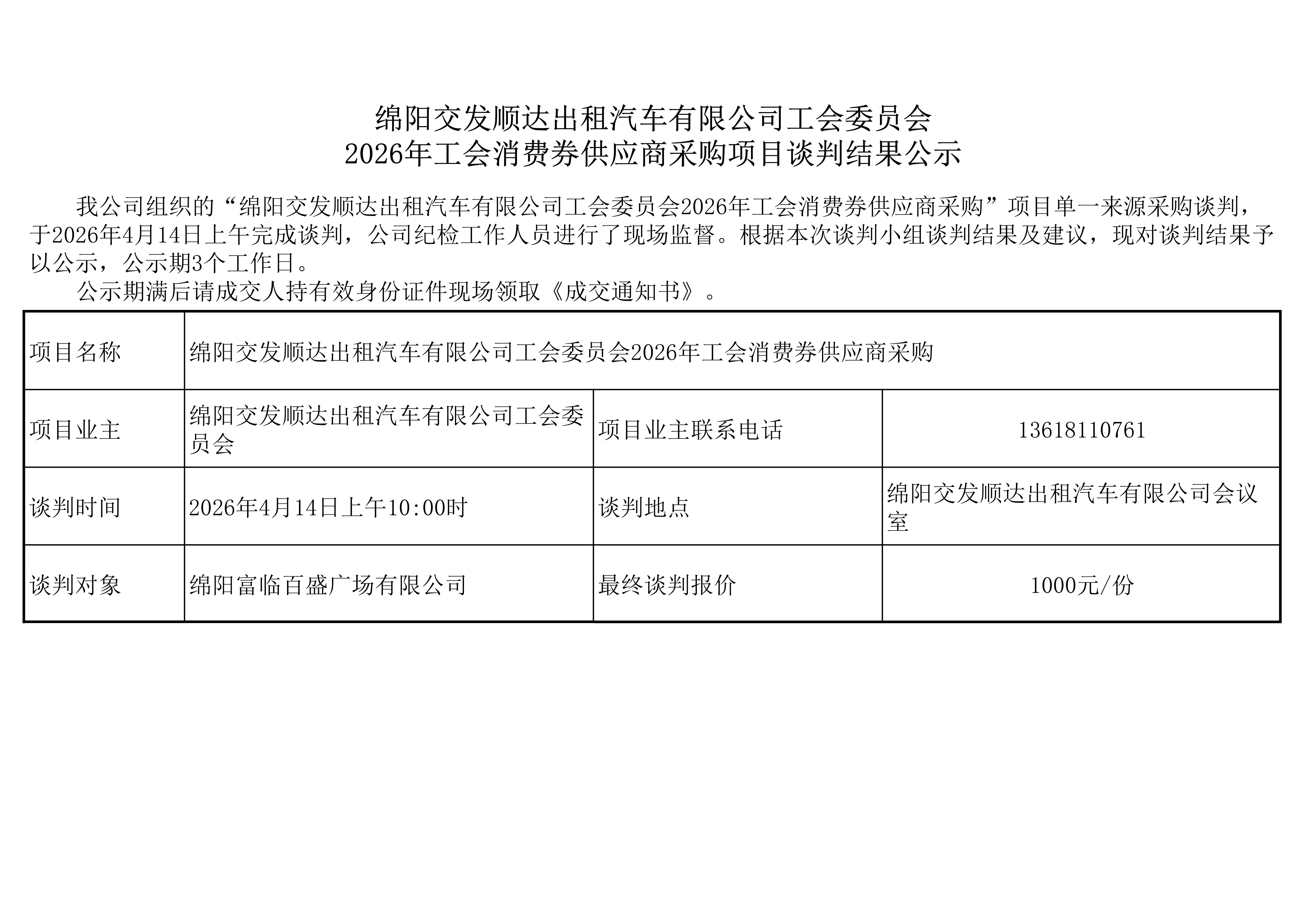 綿陽交發(fā)順達(dá)出租汽車有限公司工會委員會2026年工會消費(fèi)券供應(yīng)商采購項(xiàng)目談判結(jié)果公示