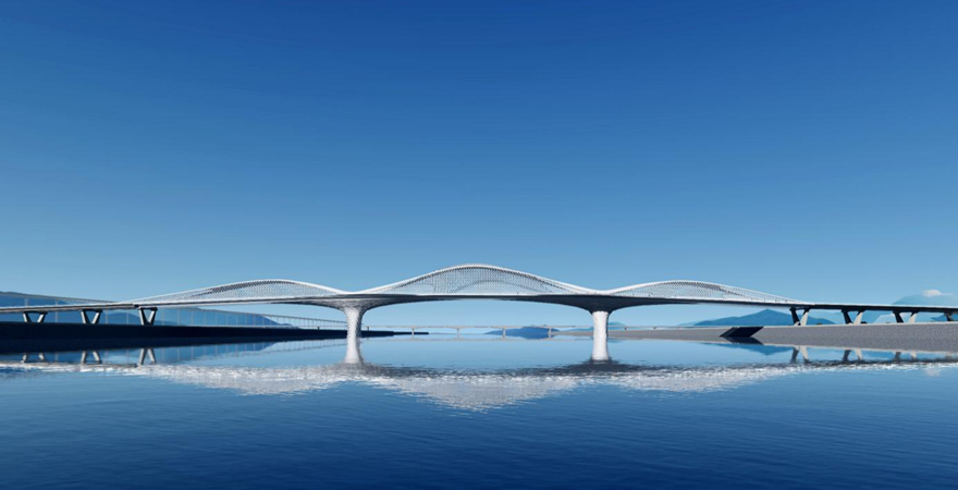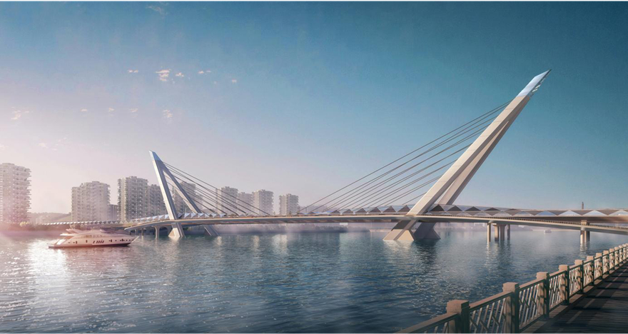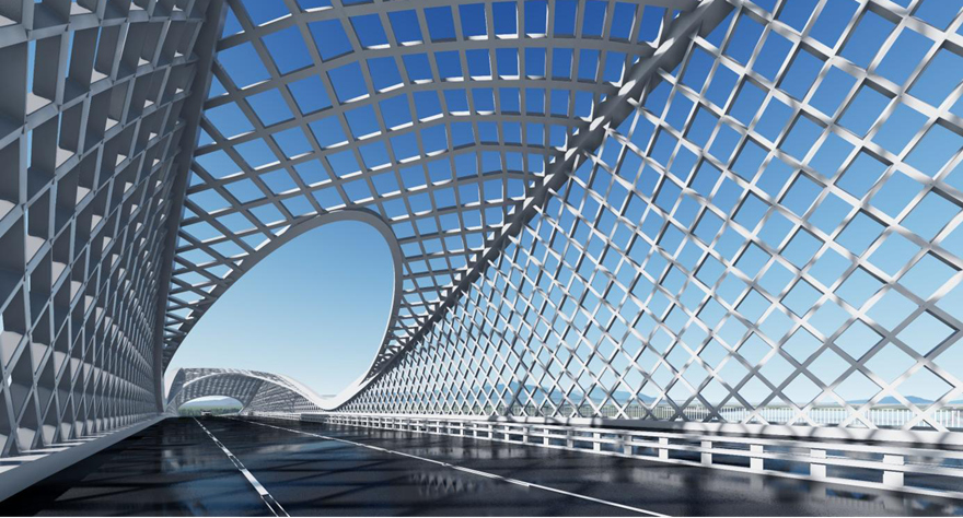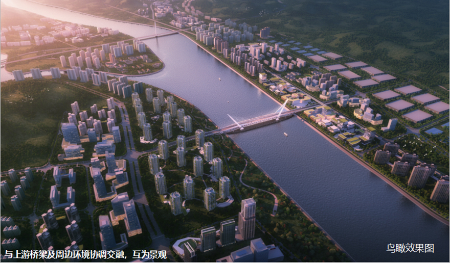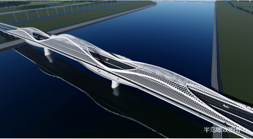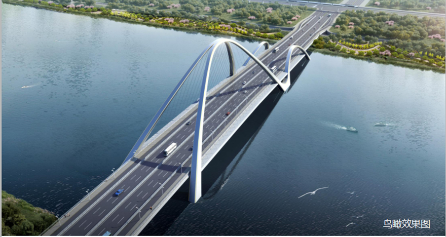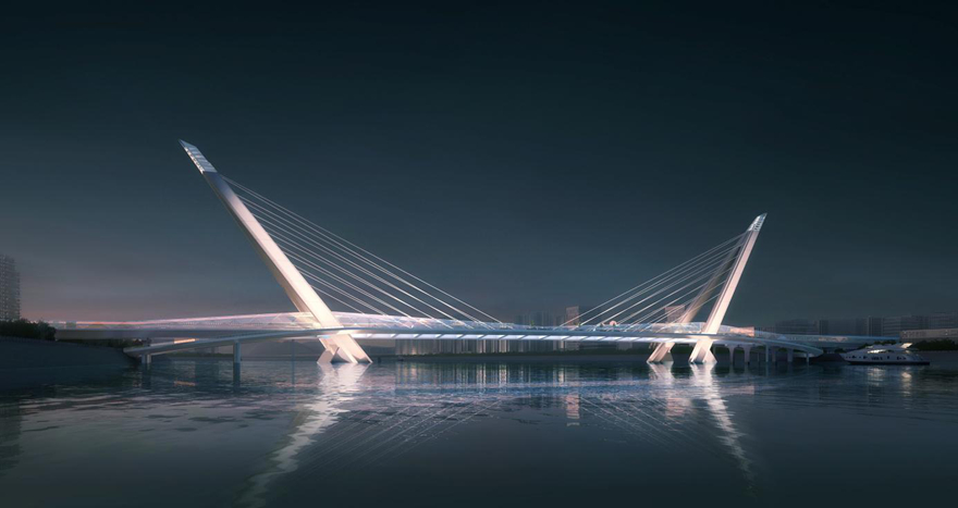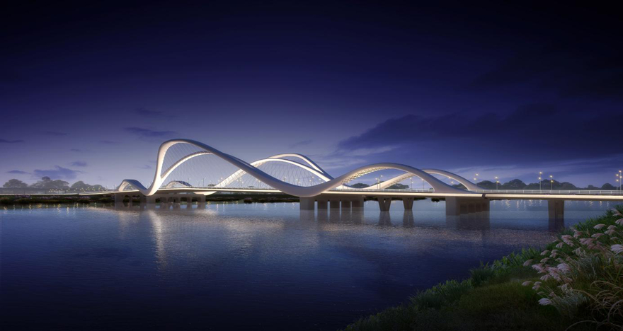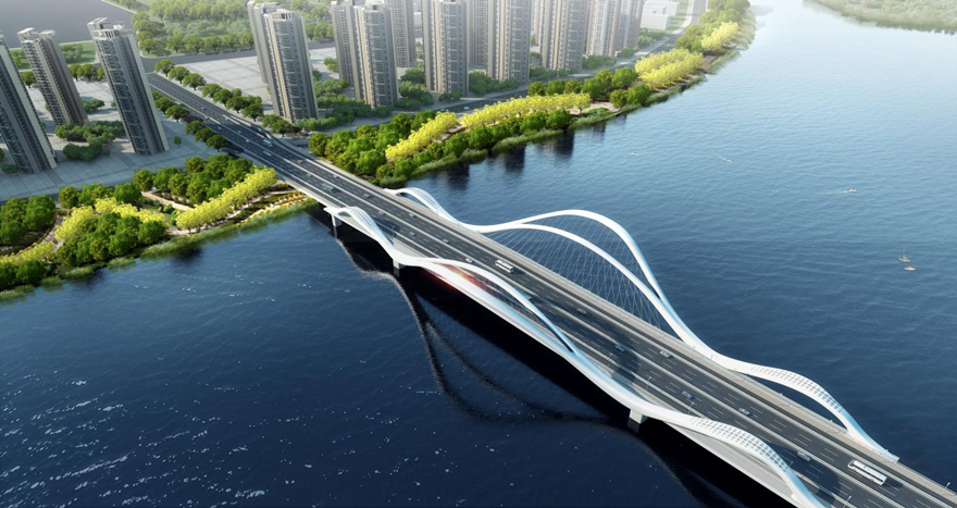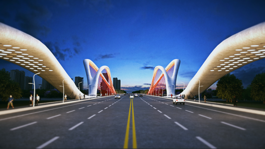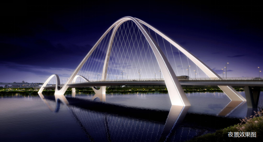 橋梁采用主橋300m下承式系桿拱橋。主拱拱肋具有雕塑感,模仿種子萌芽造型,搭配兩側(cè)小拱,形成眾星捧月之勢(shì),寓意科技創(chuàng)新的萌芽,充分表達(dá)科技城的創(chuàng)新力、生命力。