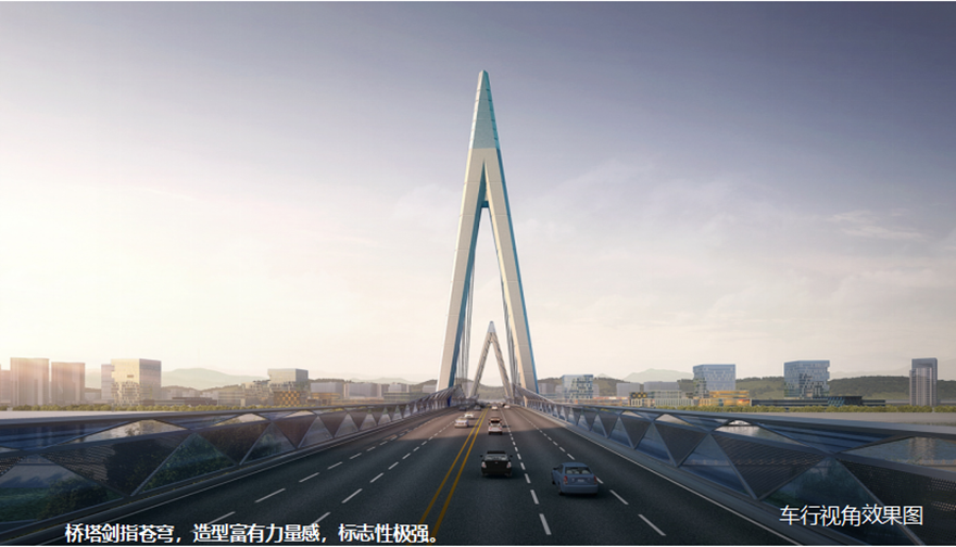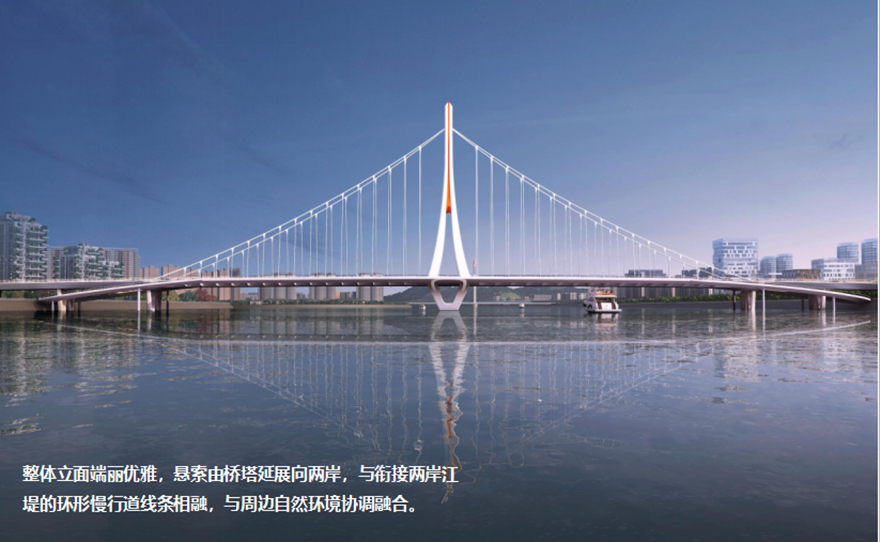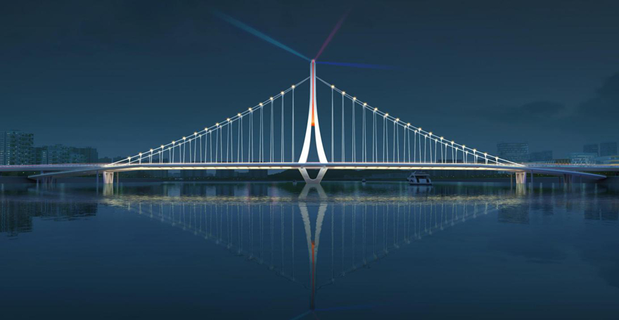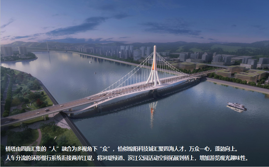 橋梁采用主跨2×156m獨(dú)塔懸索橋。方案以四面匯聚的“人”薈萃為多視角下的“眾”,融洽成“人和”,象征綿陽(yáng)人杰地靈,吸引四面八方的人才匯聚一堂,萬(wàn)眾一心,共同點(diǎn)亮屬于中國(guó)科技城的燦爛星空。