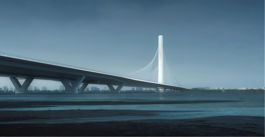 橋型采用主跨2×152m 空間索面斜拉橋。主塔似巨柱擎天,配合如禪意般的索面扭轉(zhuǎn)空間,猶如破水而出、蓄勢(shì)待飛的雕塑。